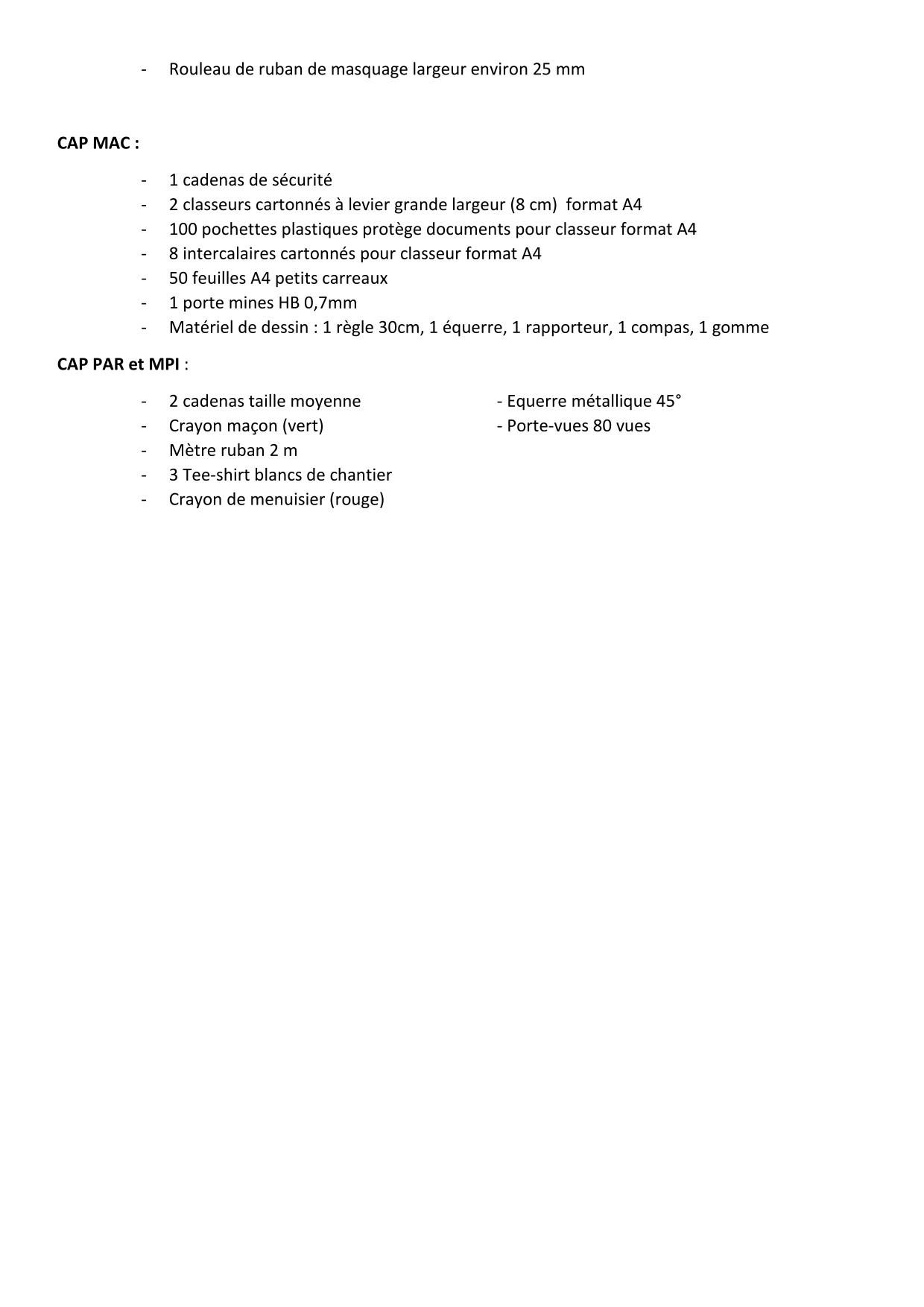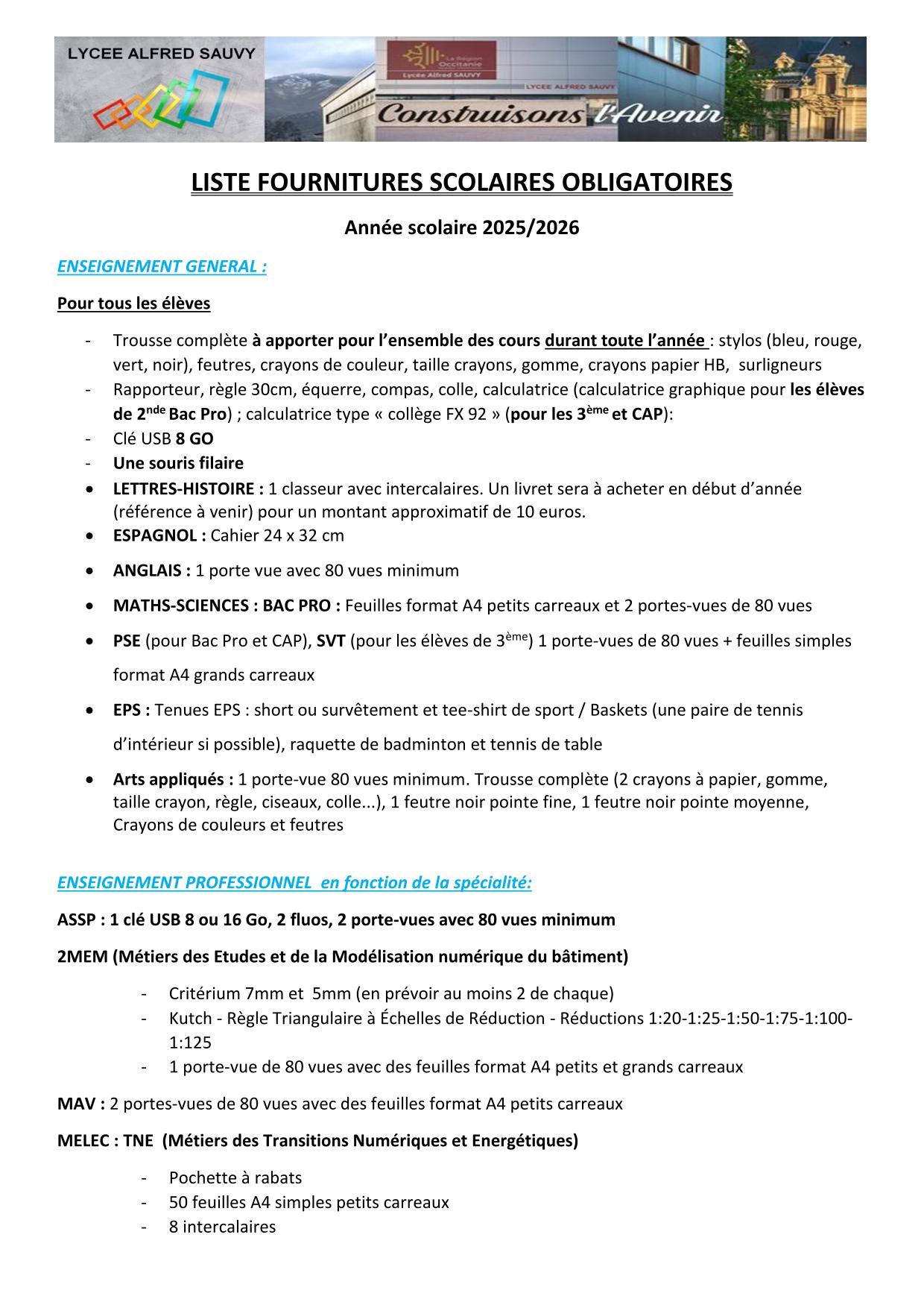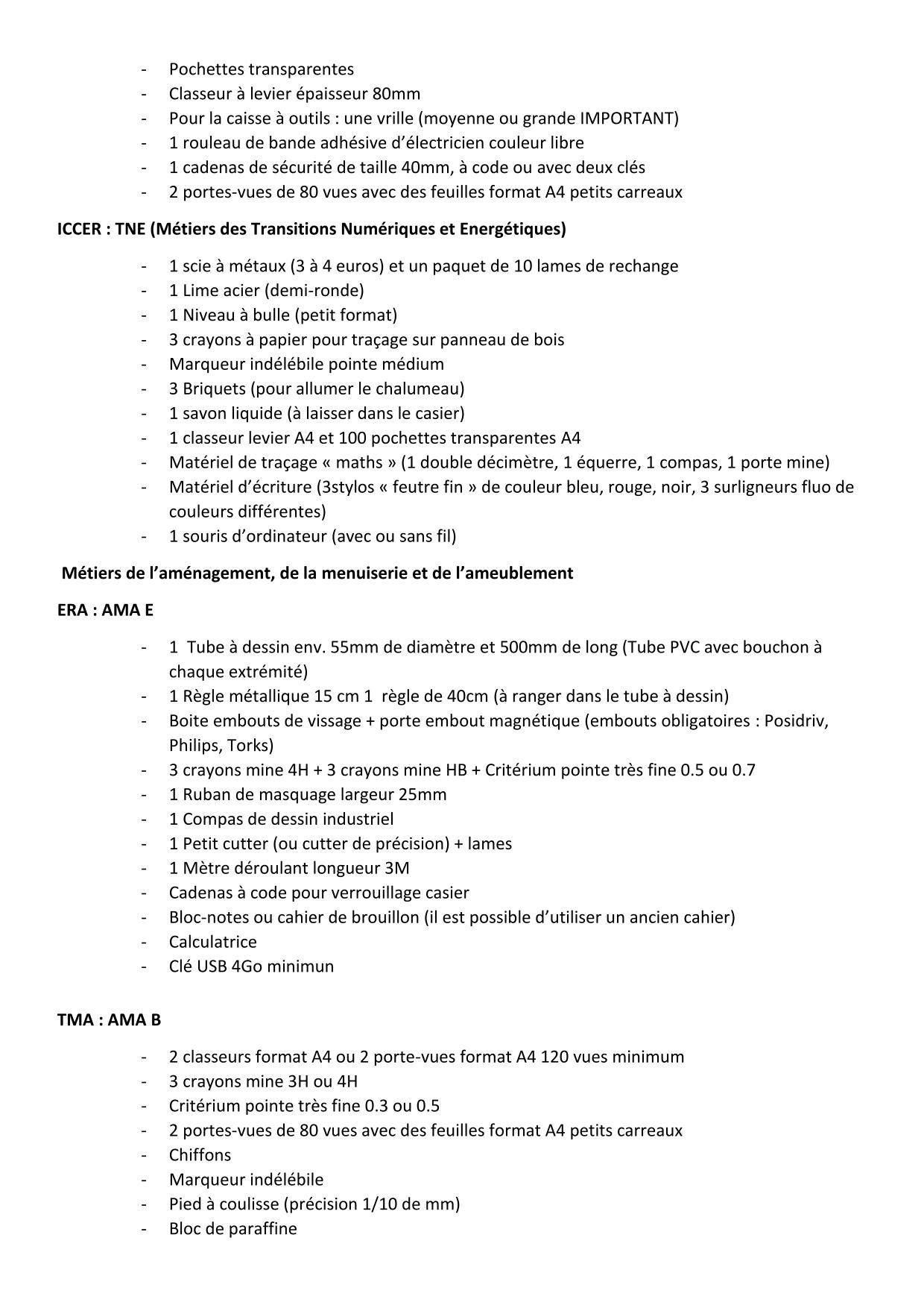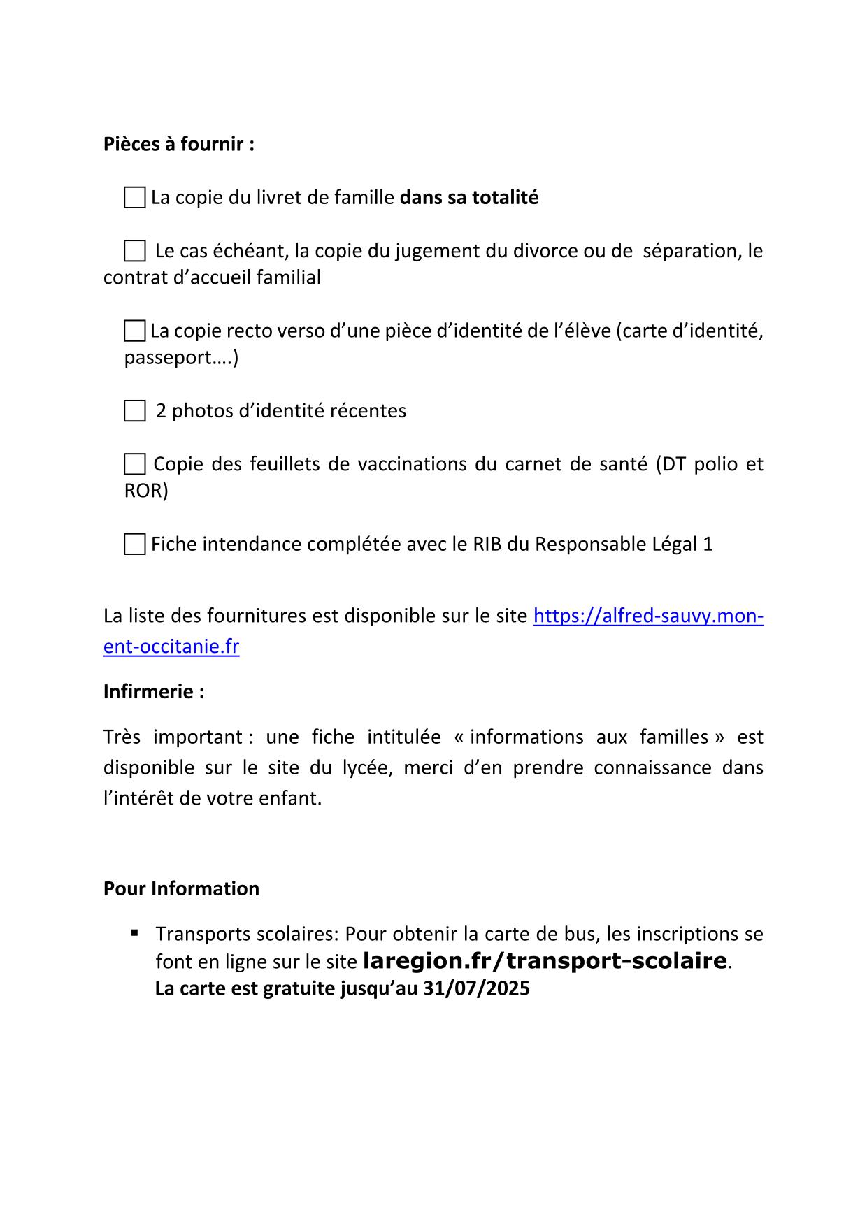 Ci-dessous les pièces à fournir, la fiche intendance, la liste des fournitures scolaires.