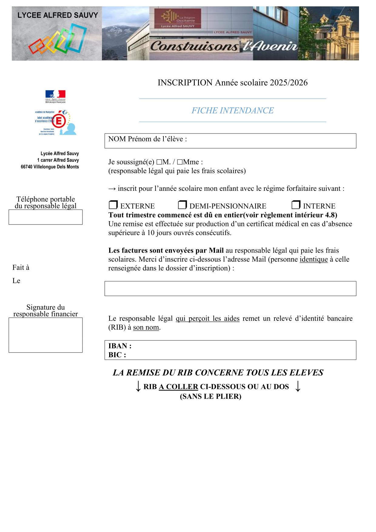 Votre enfant a été affecté au lycée Alfred Sauvy, nous vous remercions de bien vouloir vous présenter au lycée pour effectuer son inscription. Seuls les responsables légaux des élèves sont habilités à procéder à l’inscription. Il est recommandé que l’élève soit présent le jour de l’inscription. Merci de contacter le secrétariat (tél : 04.68.95.34.00) pour prendre RDV.
