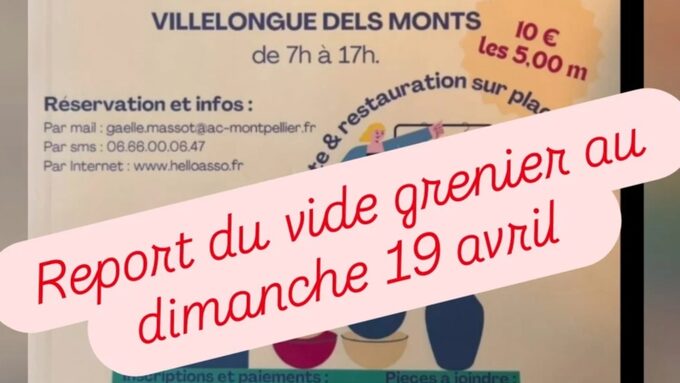 Par AUDE LIROU, publié le jeudi 12 mars 2026 12:18 - Mis à jour le samedi 11 avril 2026 14:08Vide grenier du lycée au stade de Villelongue-dels-Monts reporté au dimanche 19 avril -